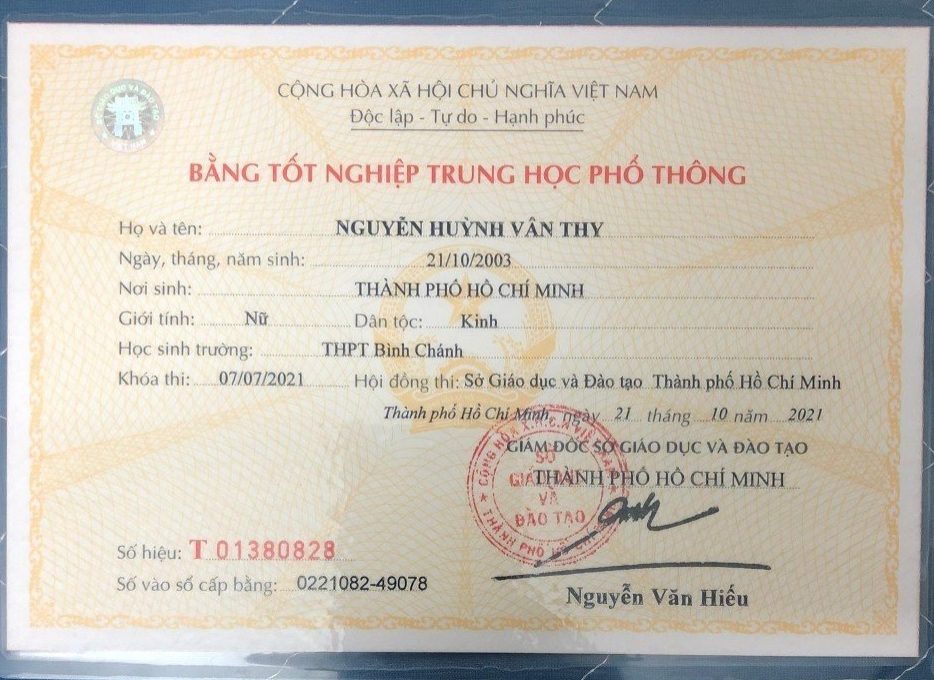 Bằng THPT – Bằng Cấp 3 được làm từ phôi thật, tem thật của các trường. Do vậy, chúng tôi đảm bảo chất lượng như bằng thật chất lượng chính xác 100%. Bao soi, bao công chứng trên toàn quốc